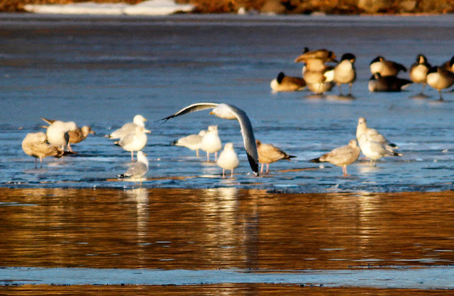 Feb 12th: Frigid conditions again with about 95% ice cover at Barton Cove/Unity Park. The subject bird was again a NO SHOW but this didn't deter at least five birders from sticking it out and waiting for the roost to come in. The birds never did arrive leaving less than 90 large gulls in a tight cluster on the ice. On the plus side, the second-cycle Lesser Black-backed Gull was present again offering nice close views and good photo opportunities. We don't know of an alternate roosting place at the moment. The power canal, for example, was devoid of gulls when checked but this doesn't mean that the birds have moved on. They could come back to the Turner's roost at any point. In addition, Bald Eagles have increased hunting activity, perhaps due to the extreme cold and the gulls won't stick around if they're being harassed by eagles.